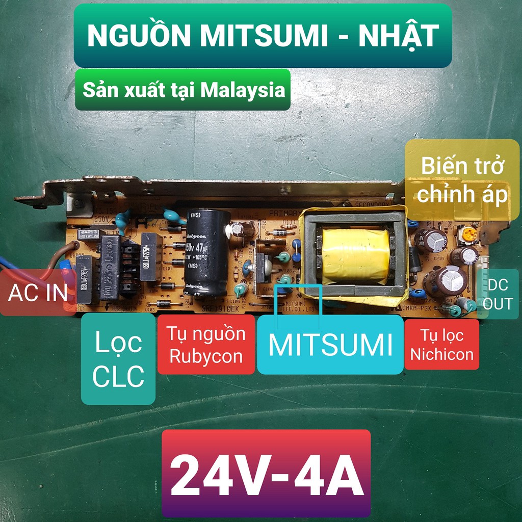 Nguồn xung chuyển đổi 220 ra 24VDC 4A CÔNG SUẤT THỰCMạch của hãng MITSUMI sản xuất tại Malay với chất lượng cao ( tụ Rubycon, lọc kỹ đầu vào đầu ra).
