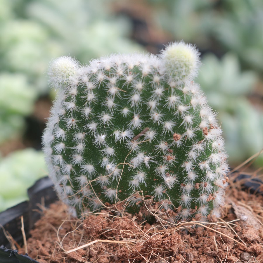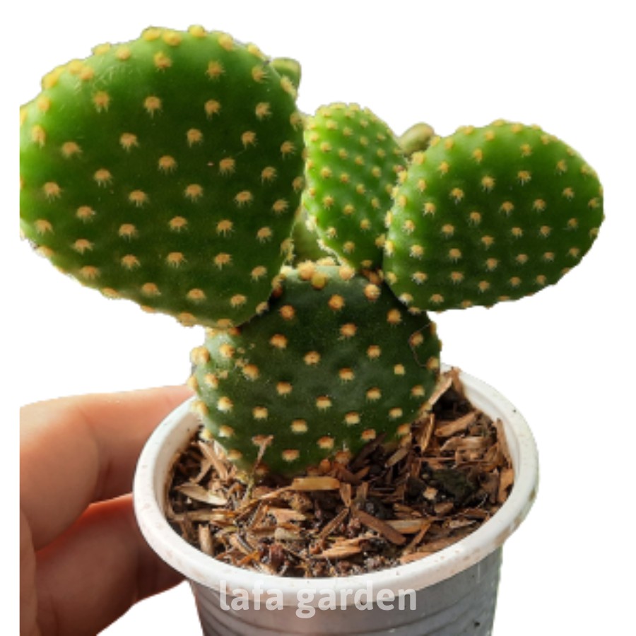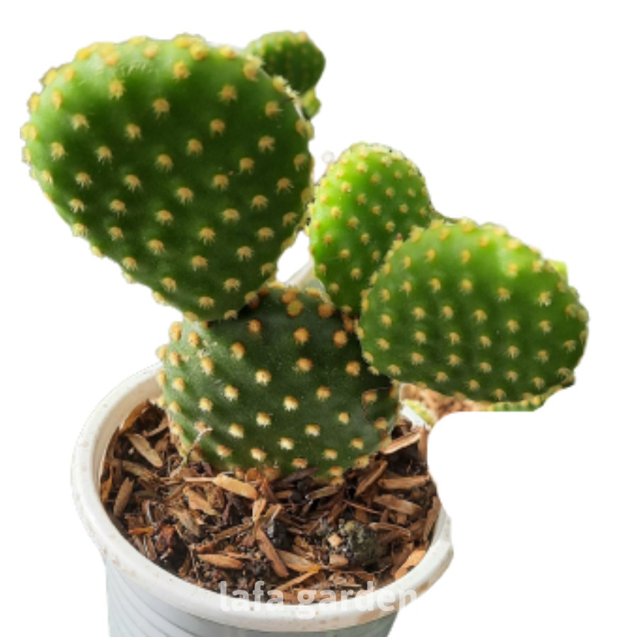Cây xương rồng tai thỏ màu trắng, có lông gai nhỏ, cây phát triển theo từng đốt lá. Là loại xương rồng dễ chăm sóc, điều kiện thích nghi với khí hậu mọi vùng miền.Cây được trồng trong chậu để trang trí bàn làm việc, tại tiểu cảnh, bonsai trong vườn.