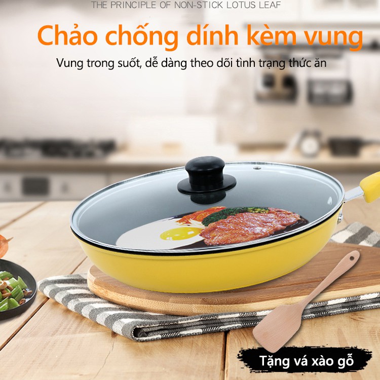 YA11 Chảo chống dính màu vàng 28cm,có nắp, tặng vá xào gỗ, chảo chiên chảo rán chảo rán cao cấp
